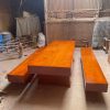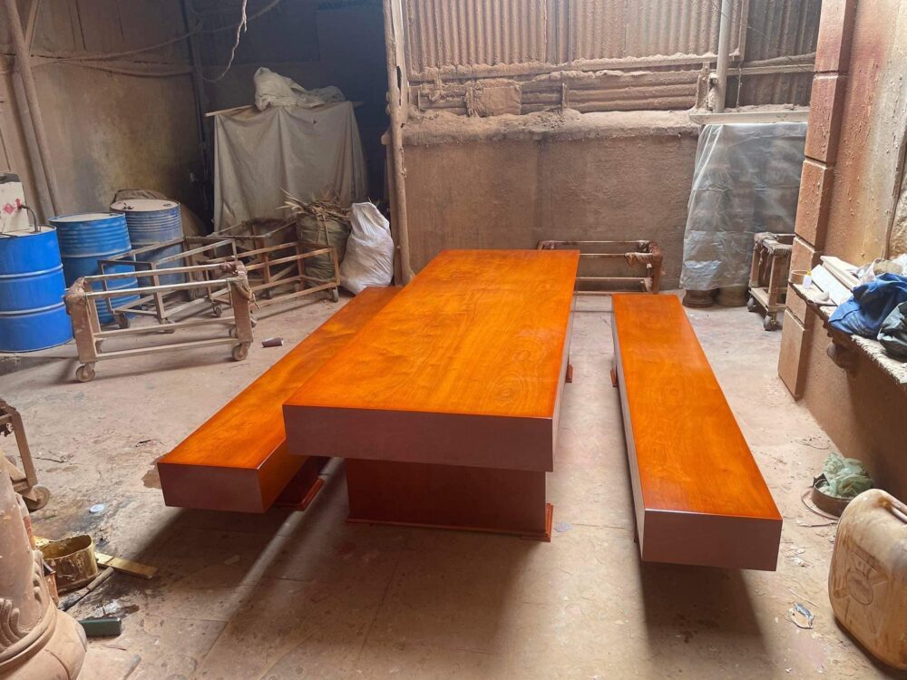 Vân Tuyển chọn, ván mặt liền. Kích thước : – Bàn 95 x 2m40, dày 20 cm, cao 75 cm – Ghế 40x 2m40, dày 20 cm, cao 45 cm